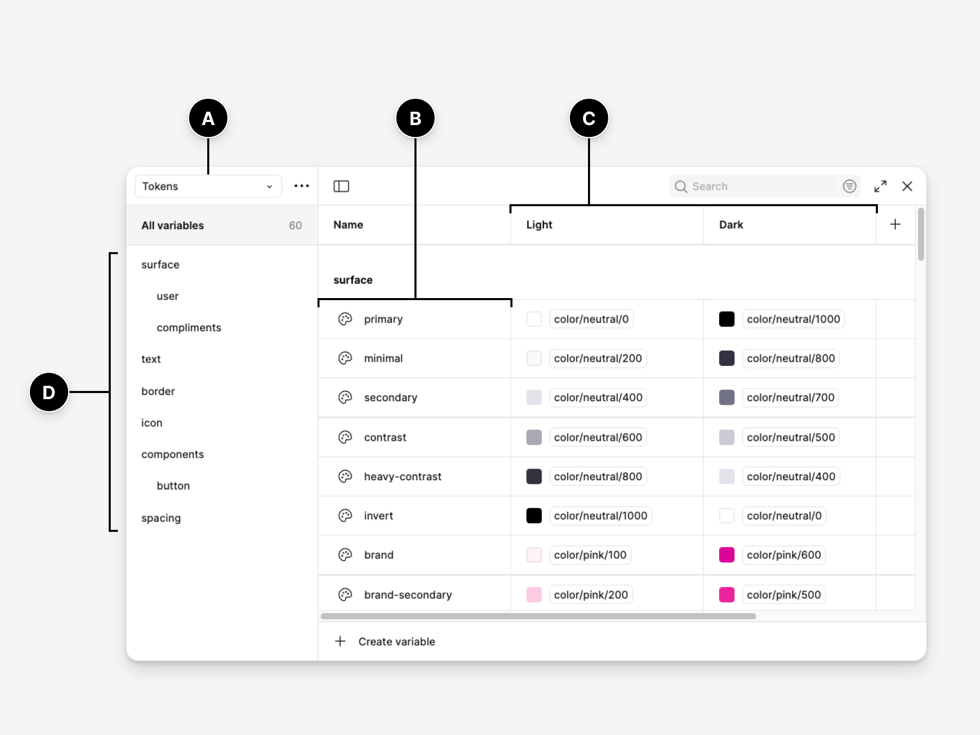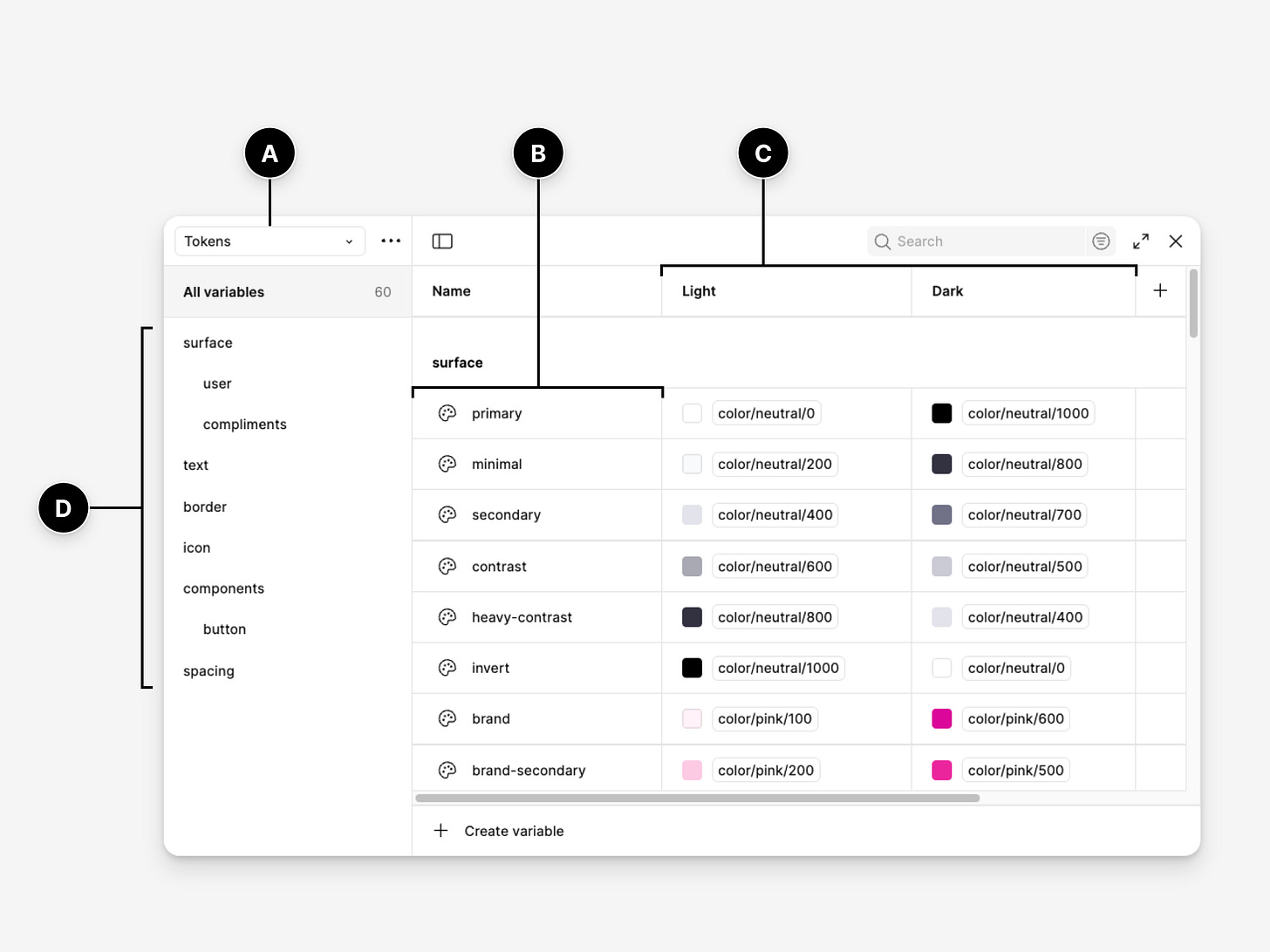 Create variable collections — Organise them following your naming contract.