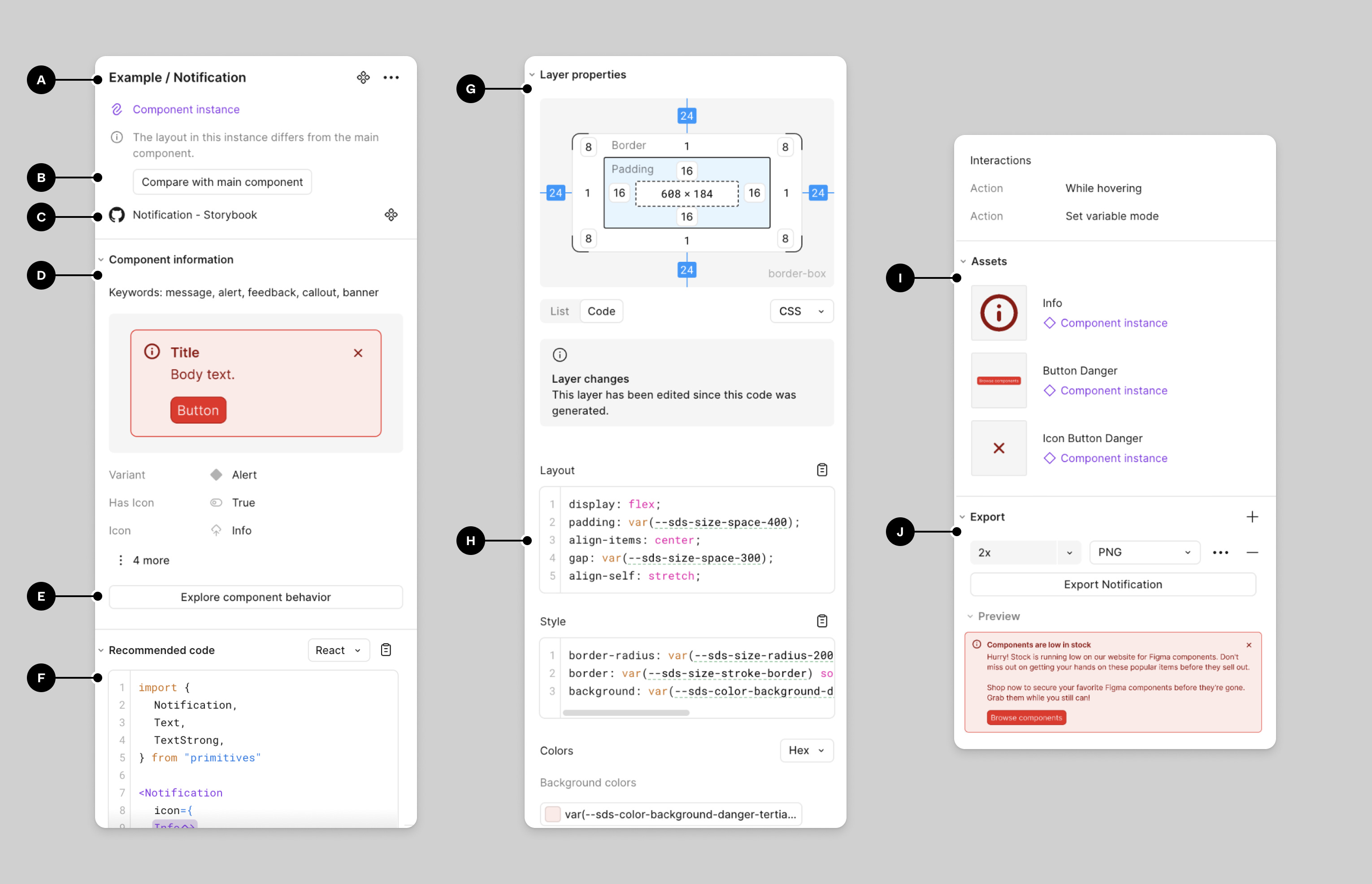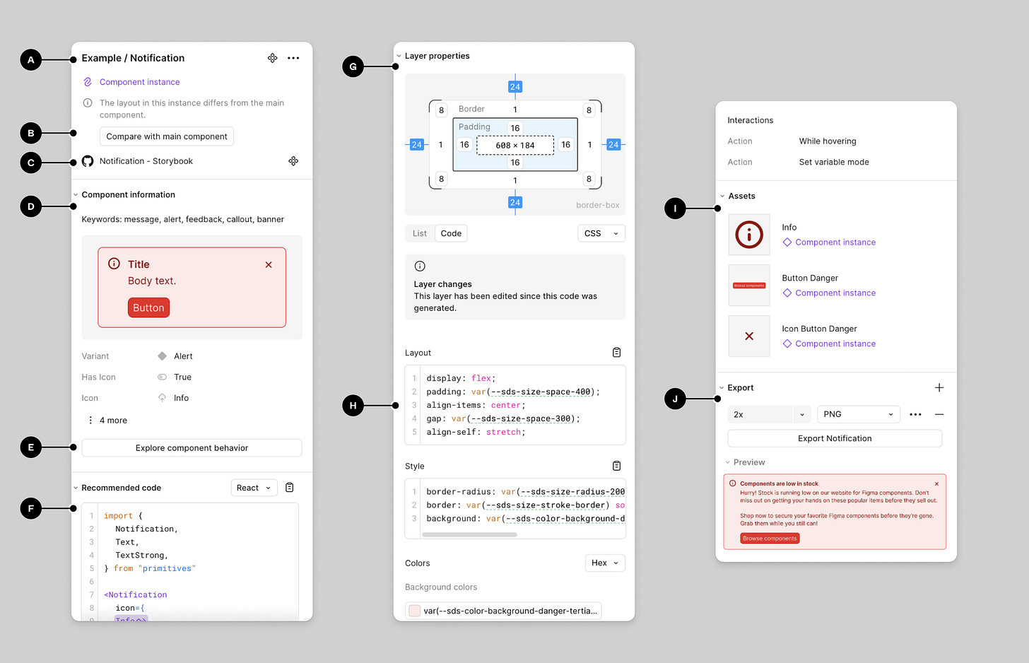 Use annotations for handoff clarity — Communicate design intent and required microcopy directly on the components or pages. Annotations help Engineers and AI understand spacing, behaviour, and implementation details that aren’t obvious from the visual alone.